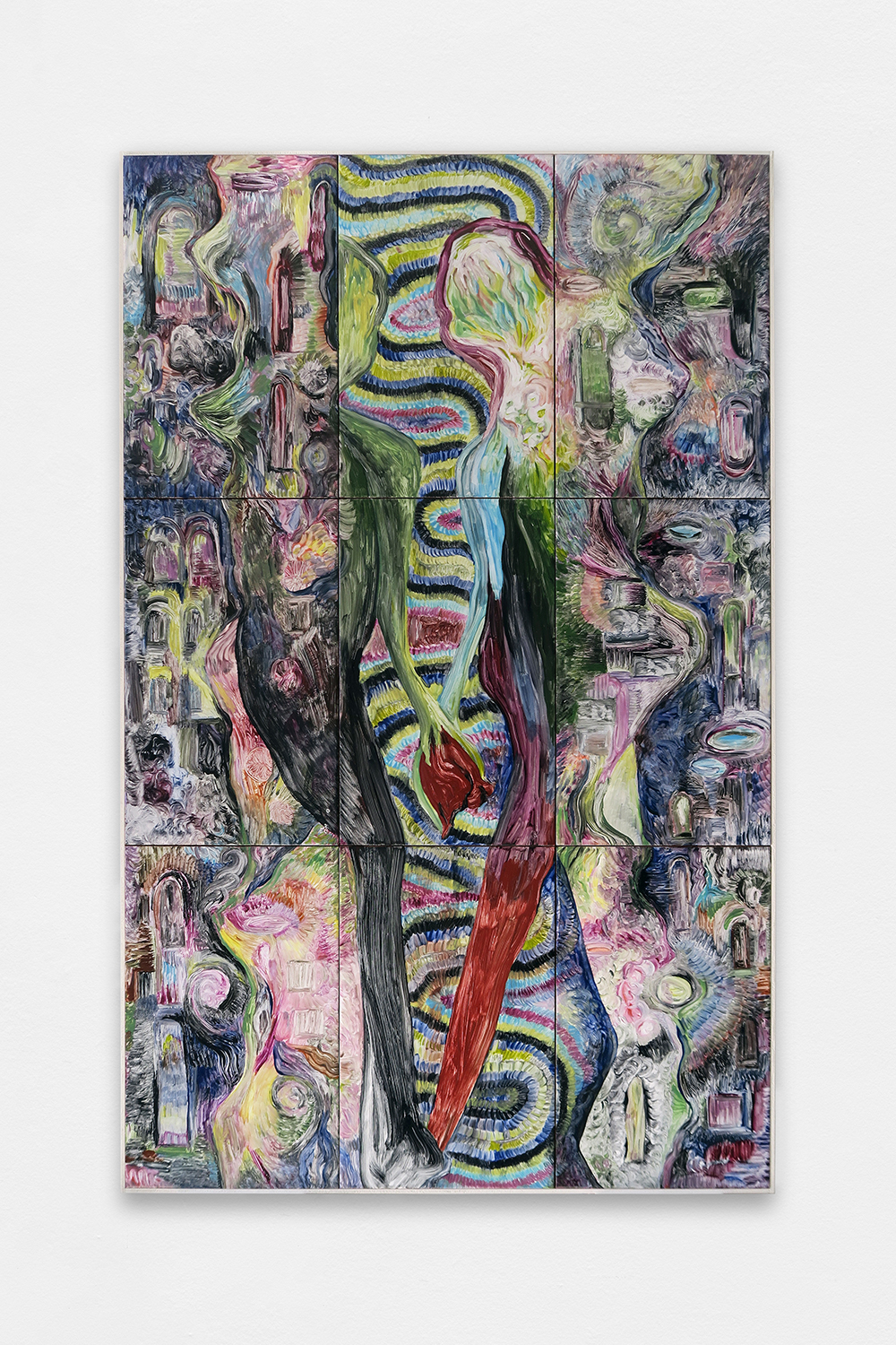 Prémonition, 2020 ; watercolour on wood, artist frame in oak wood; 168 × 109 cm