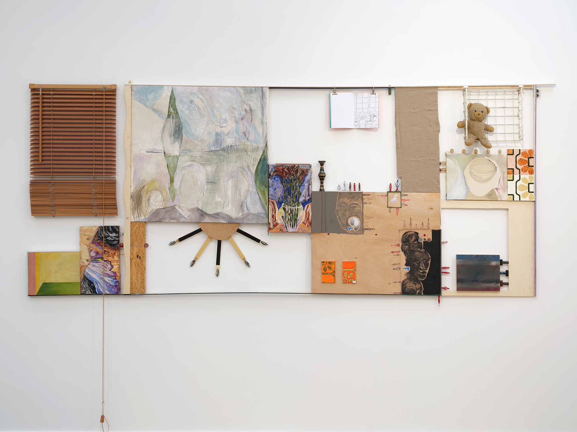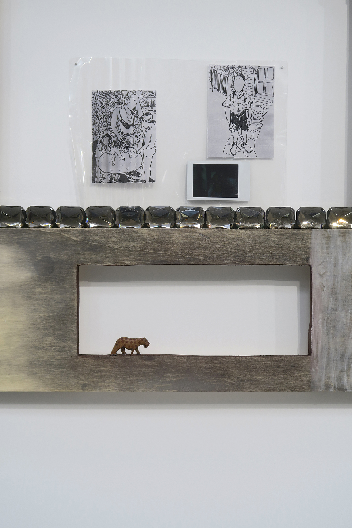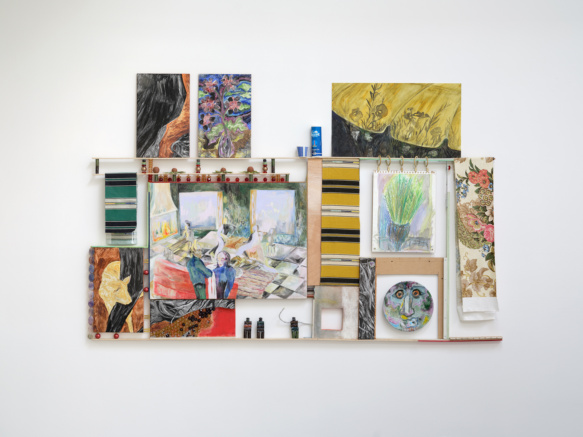 Parade (IV), 2015; walnut stain, acrylic paint, mirrors, belt buckles, leaves, marker on paper, resin, mosaic on plexiglas; 100 × 200 cm