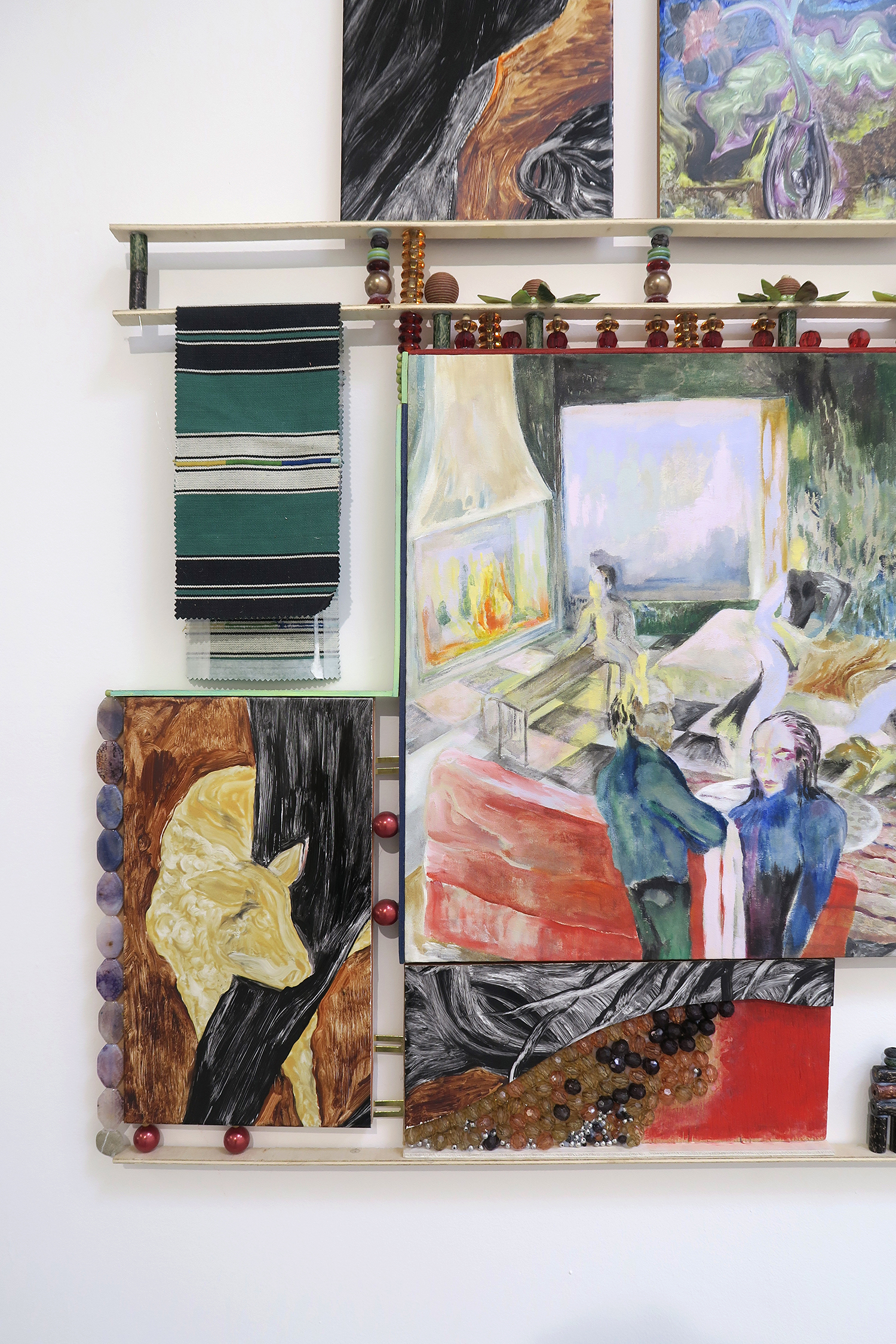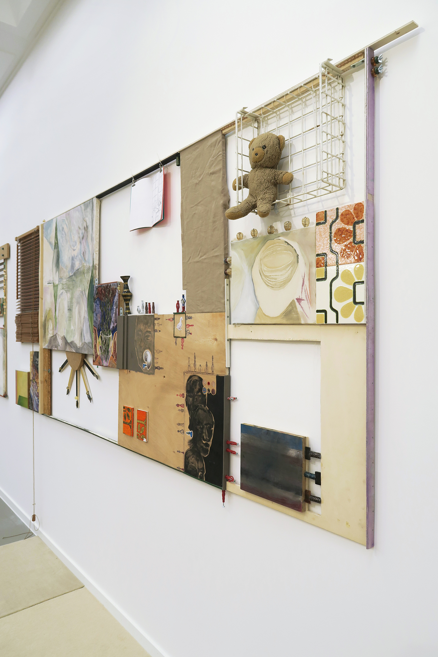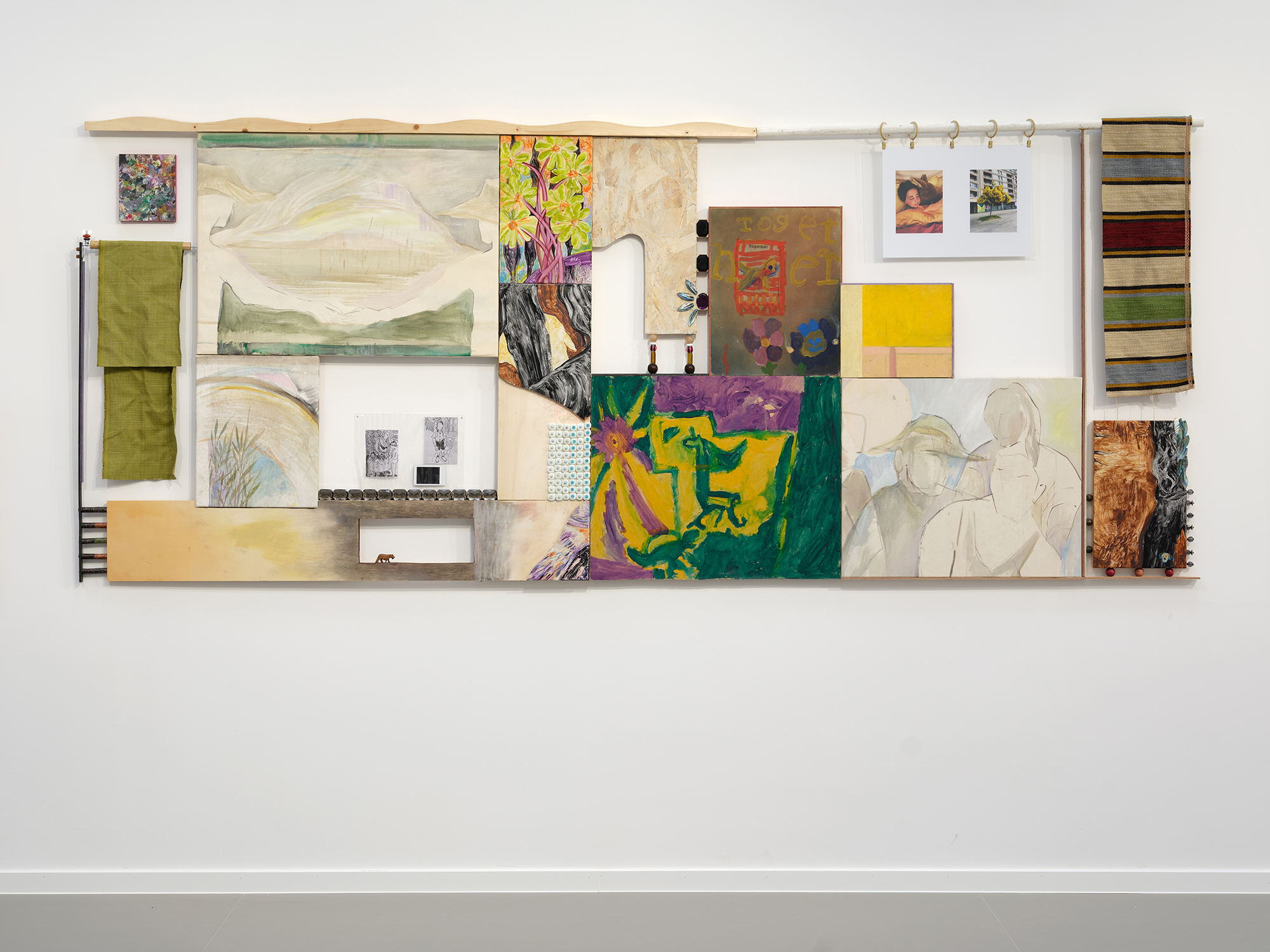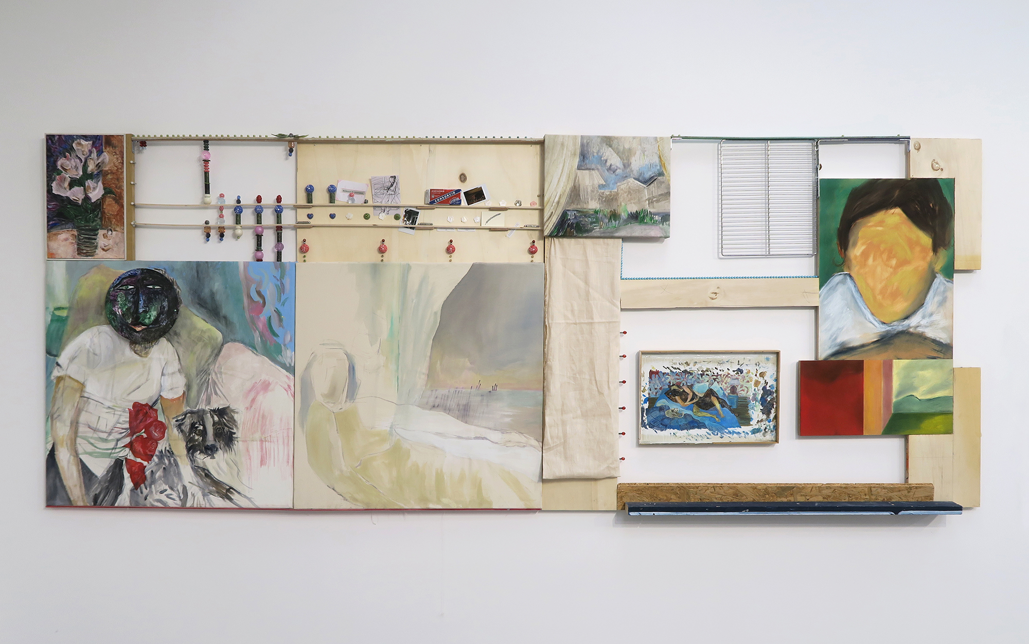 Parade (IV), 2015; walnut stain, acrylic paint, mirrors, belt buckles, leaves, marker on paper, resin, mosaic on plexiglas; 100 × 200 cm