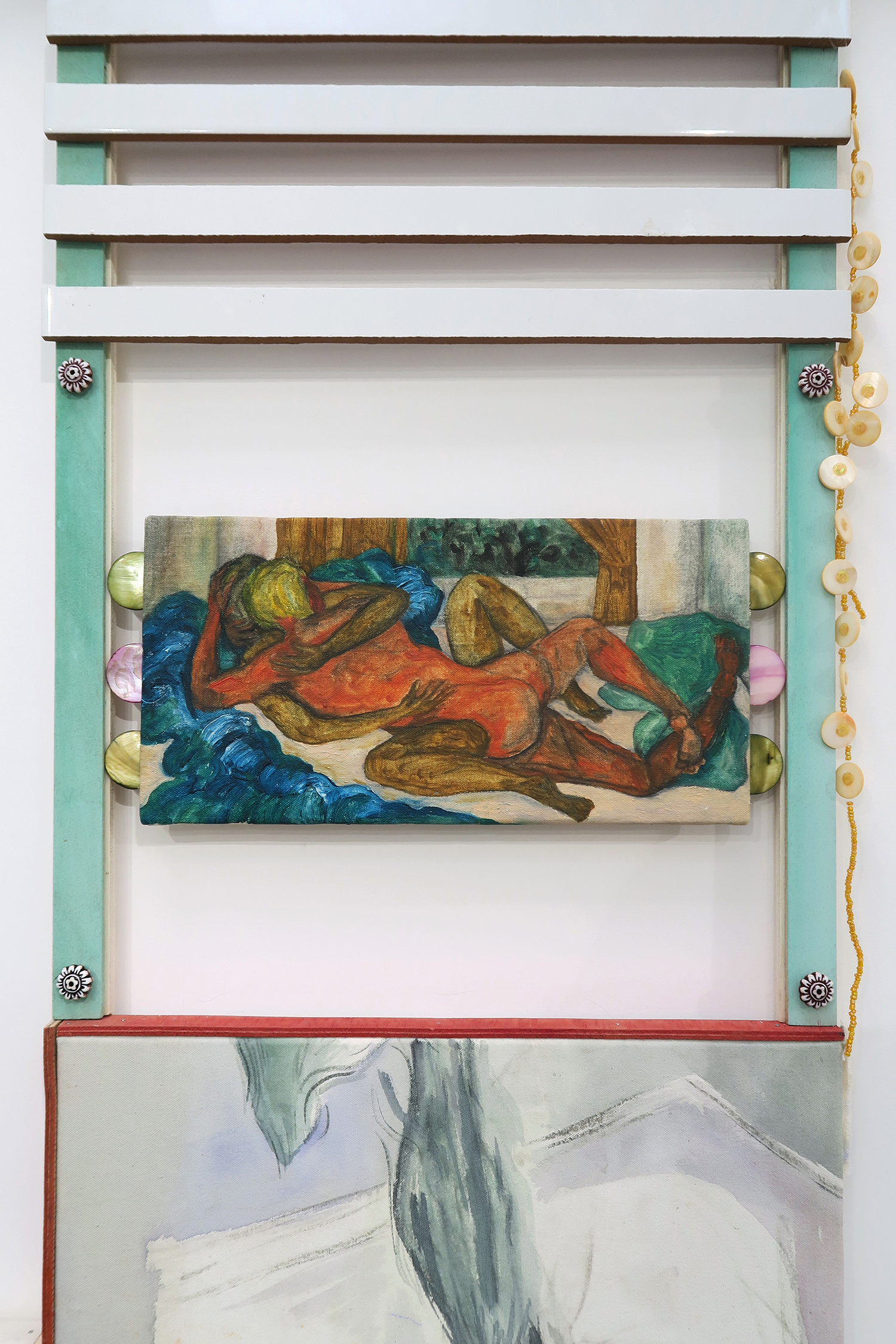 Le rêve, 2018; oil pastel on wood, painted earthenware tiles, seal, plexiglas; 62 × 78 × 3,5 cm